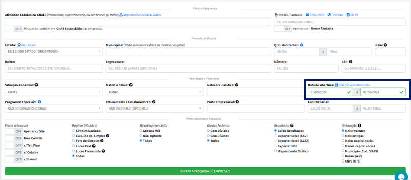 Para encontrar empresas recém-abertas no Brasil, você pode acessar gratuitamente o EmpresAqui e filtrar o período de abertura desejado na pesquisa. Você ainda pode combinar essa pesquisa com filtros de localização (cidade, estado e região) e segmento para direcionar seus resultados.